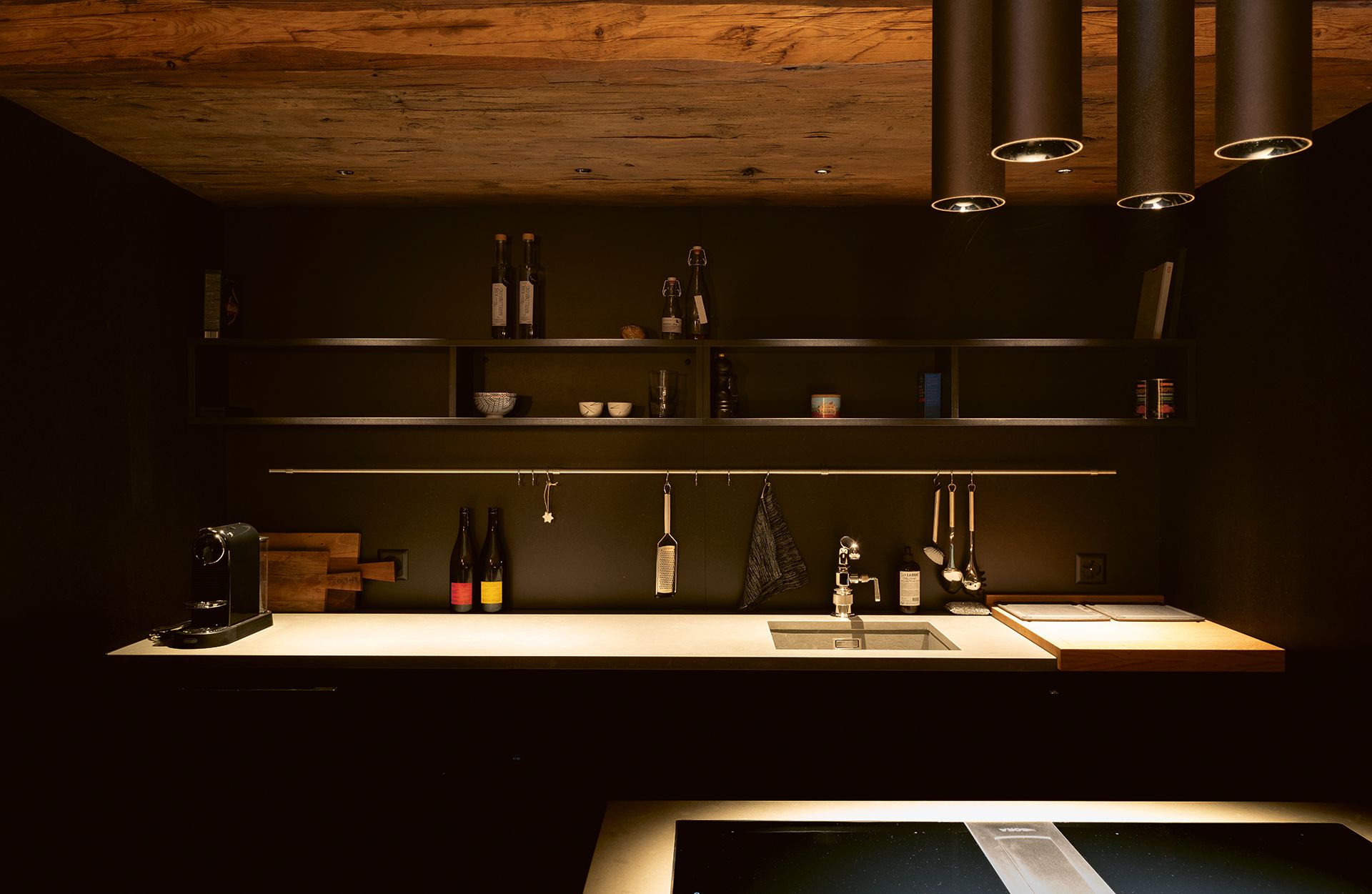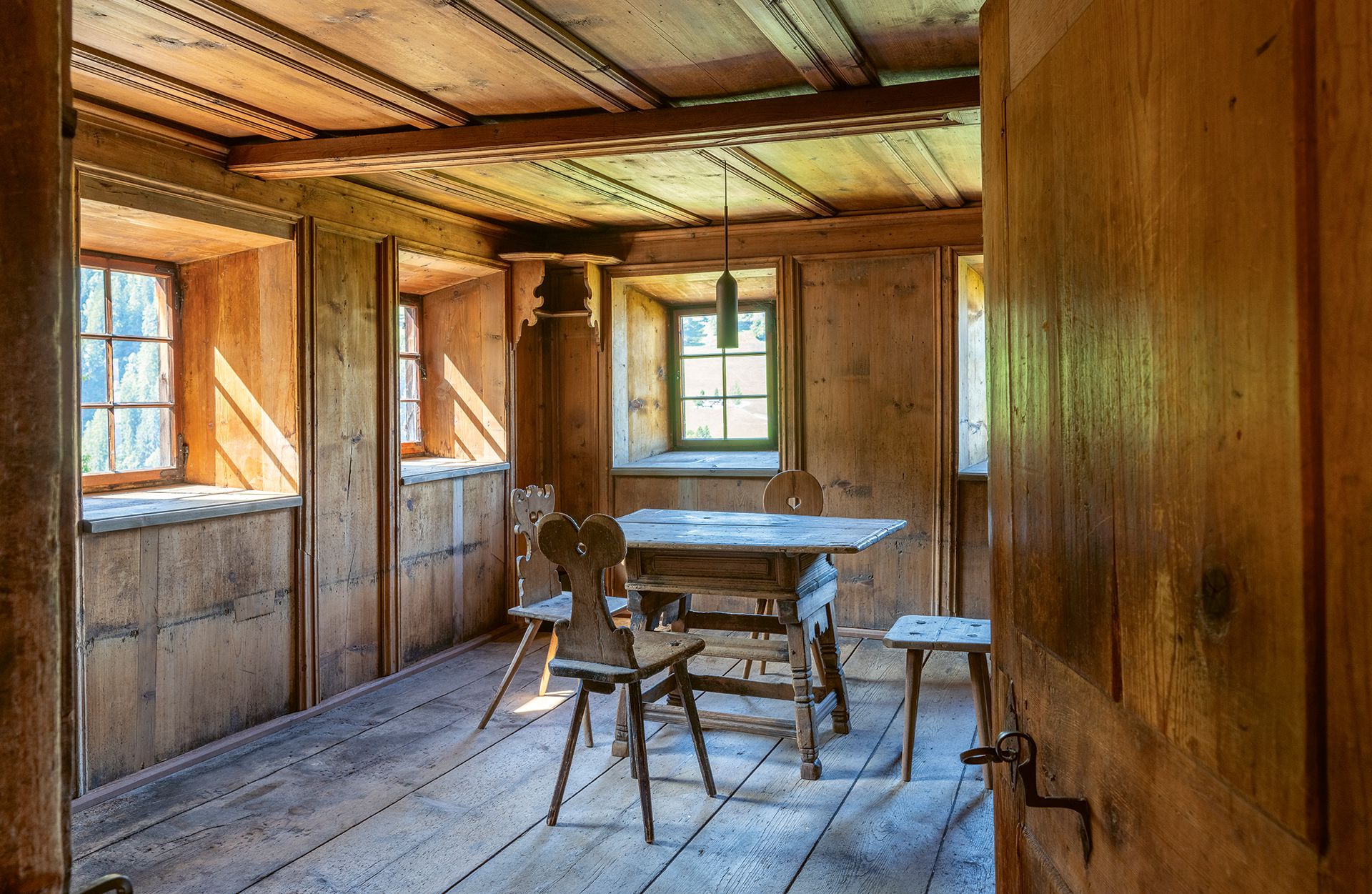 Doch Christian Widmer war nicht immer Restaurator: «Ich besuchte nach der Kochlehre und zwei Jahren auf dem Kochberuf die Schnitzerschule in Brienz und wurde dort eidgenössisch diplomierter Holzbildhauer. Dort lernte ich die Handhabung der Maschinen, lernte, wie man die Oberflächen behandelt, den Umgang mit der Kettensäge. Wenn ich jetzt ein passendes Stück Holz und Zeit hätte, könnte ich eine Kuh schnitzen. Dann kam ich zu Holzrausch und begann als Möbelschreiner, zum Erlernen des Restaurierens ging ich zu Restaurator Max Rüedi.» Ein Praktikum beim Restaurator, der auch für die Denkmalpflege arbeitete, sollte seine weitere Berufslaufbahn bestimmen. «Dort lernte ich, alte Bündner Möbel zu restaurieren, alte Türen, Böden, Decken, Truhen, Schränke, Gänterli.» Wie er dabei vorgeht? «Erst wird alles auseinandergenommen und angeschrieben, damit man später weiss, wie das Werkstück wieder zusammenzusetzen ist. Dann werden die einzelnen Teile geflickt. Was nicht mehr da ist, wird ersetzt. Danach wird das Werkstück wieder zusammengebaut.» Zum Schluss gehe es an die Oberfläche. «Sie wird gewaschen und danach so bearbeitet, dass der Charakter herauskommt.» In diesem Objekt hier etwa sind es nicht nur Böden, Decken, Wände und Türen, an denen Widmer arbeitet, das Team von Holzrausch übernimmt nach Evaluation mit dem Kunden zusammen auch die Möblierung der Räume mit ausgesuchten Bündner Bauernmöbeln.