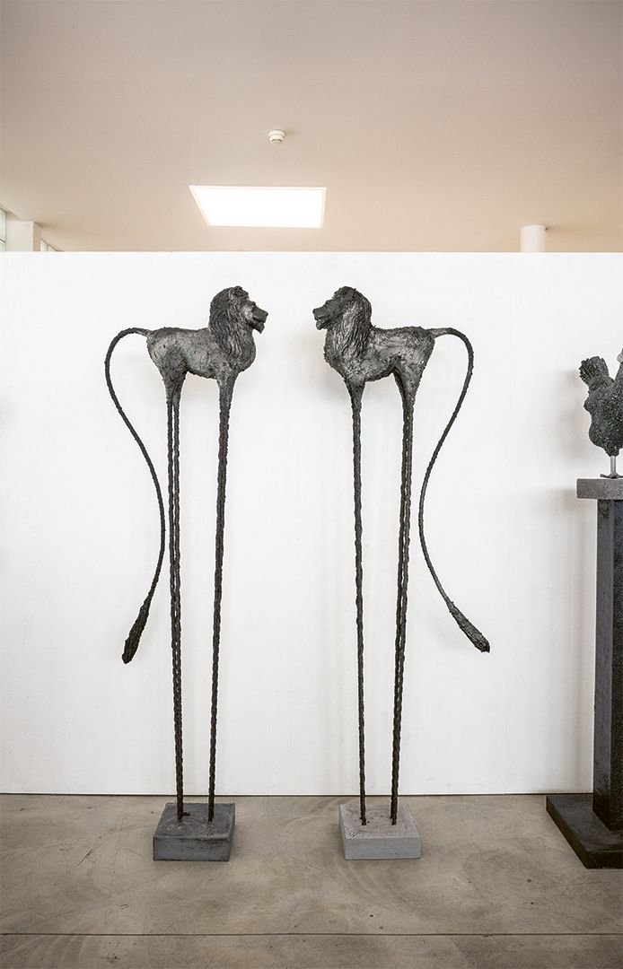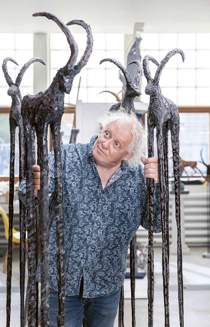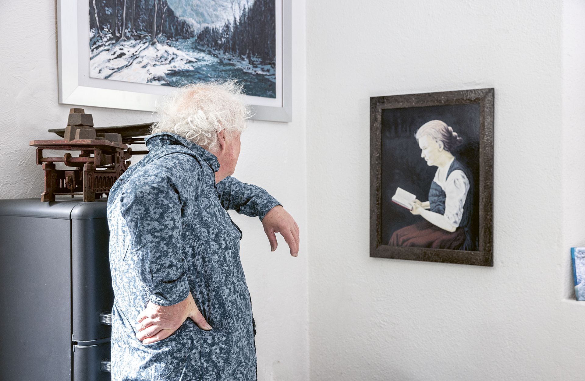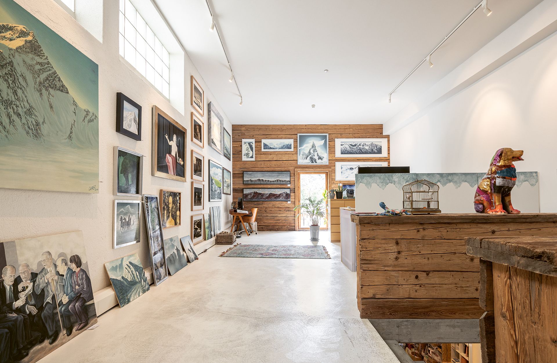 «Wir brauchen niemals einen Therapeuten», sagt Priska. «Wir nehmen alles auf, verarbeiten es und schaffen daraus unsere Werke.» So auch bei Claudios Kieshühnern aus Nolla-Kies. «Als wir noch in Andeer wohnten, hatten wir Hühner in der Nähe, die von einem alten Mann gehirtet wurden. Wir nannten ihn nur den Hühnermann. Er gab uns immer Eier – und bei den Hühnern war ein Hahn, der immer krähte.» Jetzt – in Sils – entstehen die Kieshühner. Immer wenn Priska mit Buddha spazieren geht, holt Claudio den Kies aus der Nolla. «Ich tu das oft, dass ich Material aus der Gegend nehme – und daraus habe ich dann meine Werke gestaltet.» Dabei geht es ihm darum, dieses Material in eine andere Form zu bringen, es zu verzerren, wie es der Zeit gemäss ist. So werde aus dem Naturprodukt Kies – «fast noch nachhaltig» – mit dem Epoxidharz als Werkstoff unserer Zeit eben ein Huhn. Auch das übergrosse Spatzenweibchen gehört zu diesen Tieren oder die aus Beton gegossenen und beschichteten Murmeltiere.