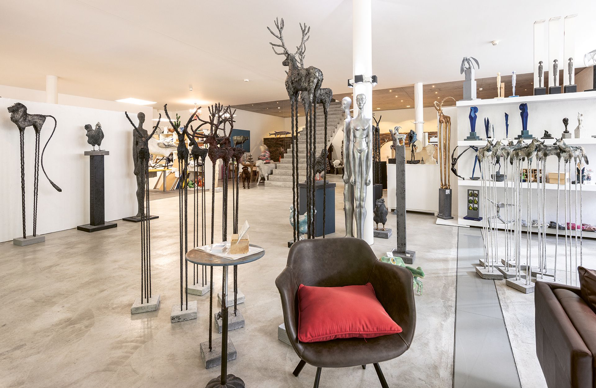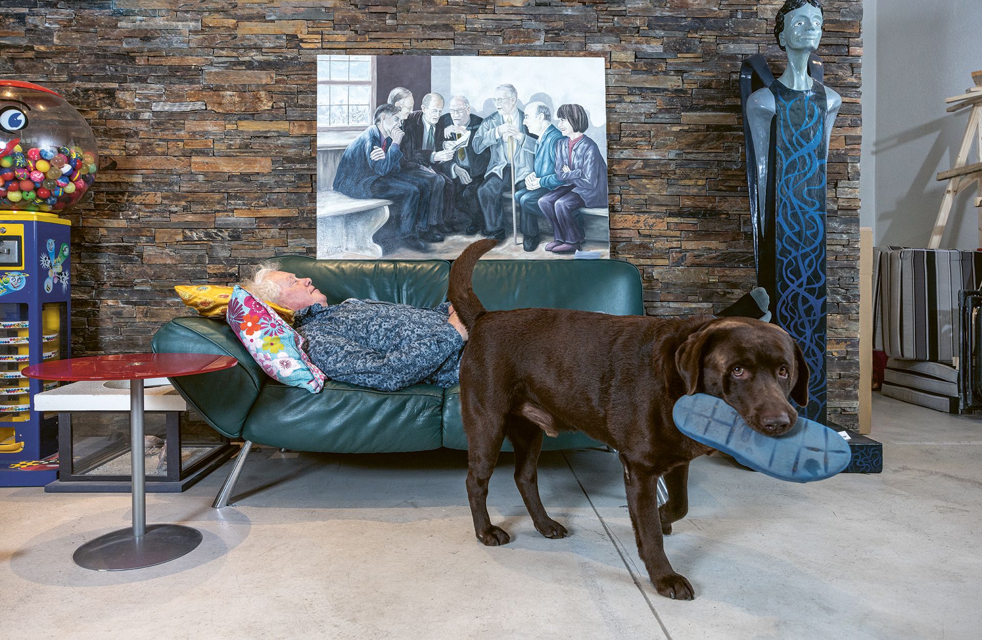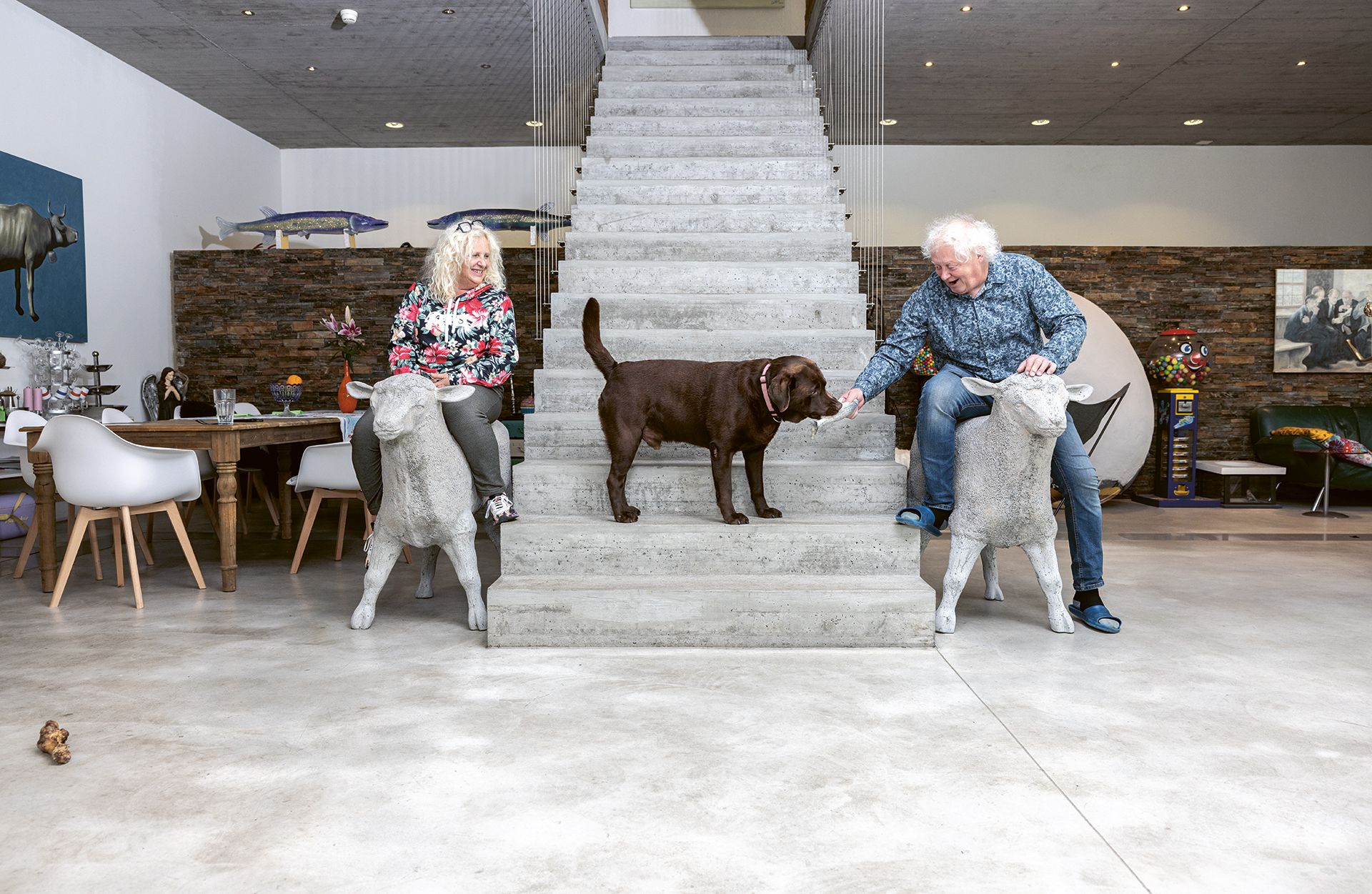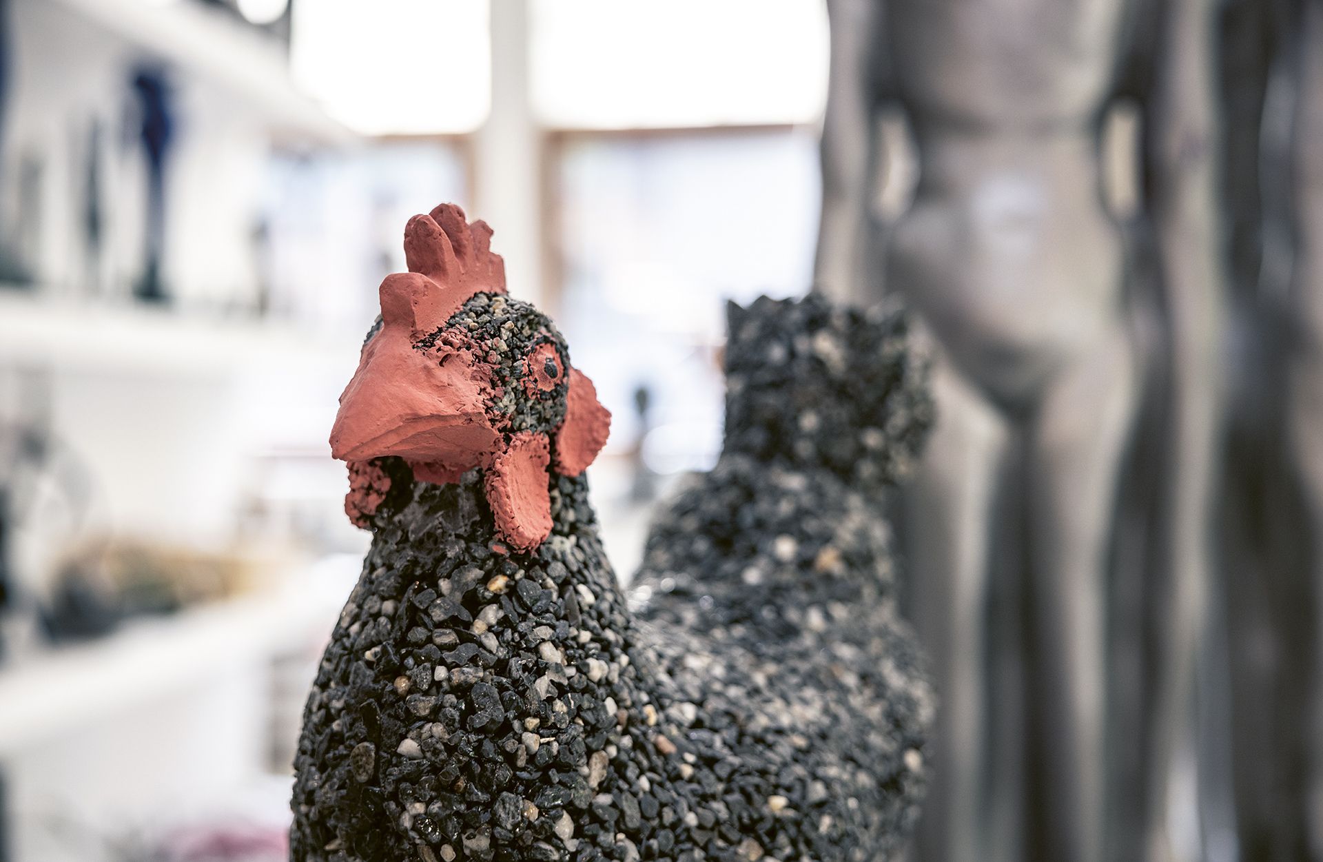 «Wir brauchen niemals einen Therapeuten», sagt Priska. «Wir nehmen alles auf, verarbeiten es und schaffen daraus unsere Werke.» So auch bei Claudios Kieshühnern aus Nolla-Kies. «Als wir noch in Andeer wohnten, hatten wir Hühner in der Nähe, die von einem alten Mann gehirtet wurden. Wir nannten ihn nur den Hühnermann. Er gab uns immer Eier – und bei den Hühnern war ein Hahn, der immer krähte.» Jetzt – in Sils – entstehen die Kieshühner. Immer wenn Priska mit Buddha spazieren geht, holt Claudio den Kies aus der Nolla. «Ich tu das oft, dass ich Material aus der Gegend nehme – und daraus habe ich dann meine Werke gestaltet.» Dabei geht es ihm darum, dieses Material in eine andere Form zu bringen, es zu verzerren, wie es der Zeit gemäss ist. So werde aus dem Naturprodukt Kies – «fast noch nachhaltig» – mit dem Epoxidharz als Werkstoff unserer Zeit eben ein Huhn. Auch das übergrosse Spatzenweibchen gehört zu diesen Tieren oder die aus Beton gegossenen und beschichteten Murmeltiere.